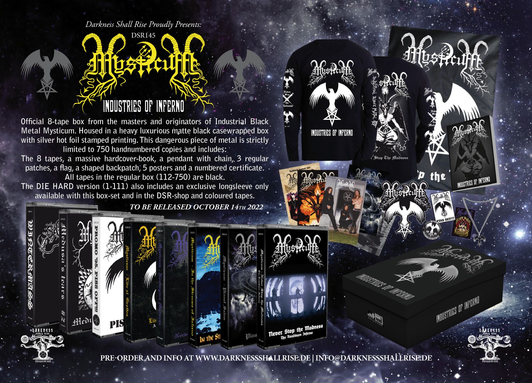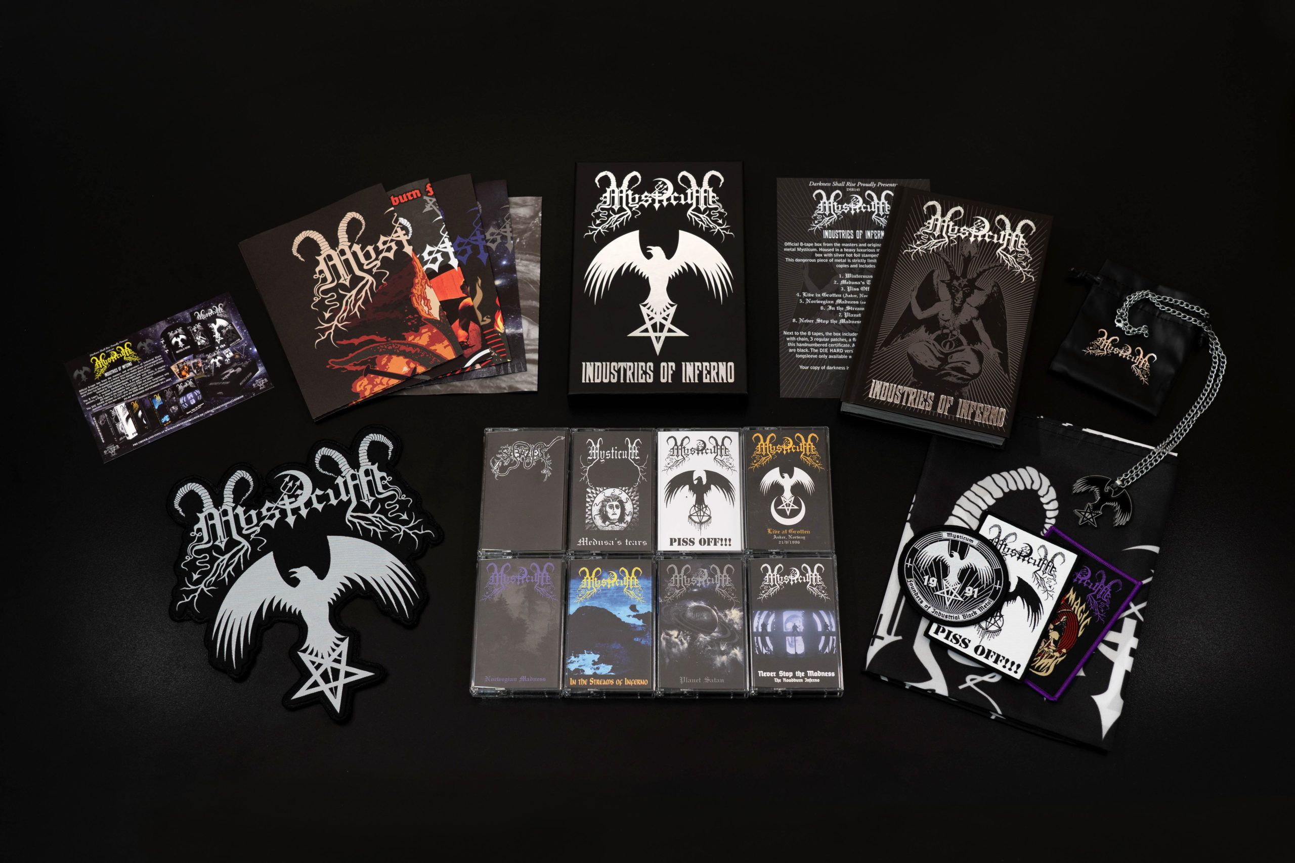 Includes 8 cassettes, hardcover book, shaped back patch, banner, chain pendant, 3 patches, 5 posters, and numbered certificate.
